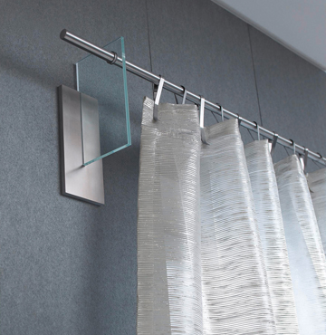 The View 2 curtain rail system combines the materials stainless steel and glass in a functional and elegant way. The combination of a brushed stainless steel base plate and a glass element arranged at right angles results in a floating appearance of the rail. In this way, the bracket design turns into an eye catcher in the room. The View 2 strives to meet customers’ desire for clearness and transparency.