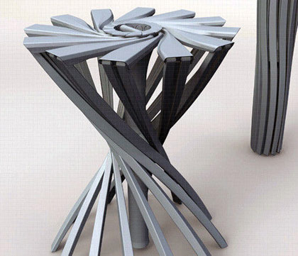 這是一個可以收納起來的桌子,以中間的柱為軸,旋轉開來像花朵一樣綻放,形成一個桌子,收起來就是一個簡單的柱體,存放比較方便。如果居室里有一個這樣的桌子,是不是很給主人爭面子啊。