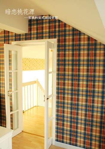 這面墻全貼的格子墻紙,門也很特別