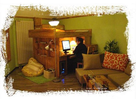 書柜和書桌一體很常見,連床也連在里面確實(shí)很少見。這么做,的確節(jié)省了很多空間。