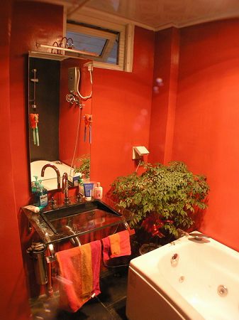 濃郁的紅色與金屬質(zhì)地的玻璃臺(tái)盆形成了柔與剛的強(qiáng)烈的視覺感