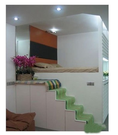 首先房型是不規(guī)則型,在有限的面積內(nèi),給人以空間的擴(kuò)張感,相當(dāng)了不起。請(qǐng)注意: 那上面是張床。