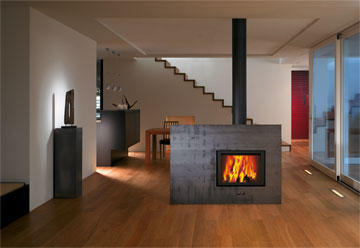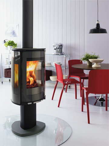 According to Greek mythology, Prometheus stole fire from the gods, angering them because he brought it to man, making them equal to the gods. Human civilisation could not have evolved without fire. It was thanks to fire that man survived in the wilderness, and the image of a family huddling together around a warming stove during long winter nights is still the epitome of domestic cosiness and security. The Jotul 373 wood burning stove is purist and functional in its design and opens up new possibilities of how to make use of a stove in a room. What is innovative about the stove is that it can stand free almost anywhere in the room and thus creates a new living room quality. It features a detailed design, unique precision in the cast iron, and can be operated from all sides. Furthermore, the wood burning stove can be rotated 360 degrees when it is fitted with a flue outlet at the top and with a turntable. In order to adapt to a variety of different interiors, the basic models of the three stoves in this range can be fitted individually and combined with a variety of leg sets. The stoves can also be fitted with an additional glass front panel that lowers the surface temperature on the front. Another unique and well-conceived feature is the decorative panels for the side windows. The panels protect walls and furniture from direct radiant heat and create evocative shadow figures on the walls. In order to give the experience of true open fire, the wood-burning stove has been designed with large glass sides – giving a direct view on the elementary play of the flames.