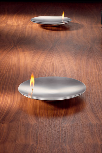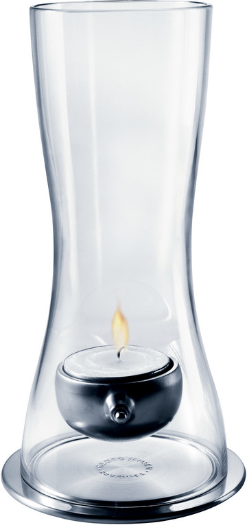 To avoid burning one's fingers when lighting a tea-light the candleholder has a special "loop" mechanism. A weight in the candleholder makes the holder automatically revolve and locate itself in the correct position. The candleholder is held by two side springs that makes it simple to remove from the glass by using a pointed object to press the metal connector. The outer glass rests on a stainless steel tray.
