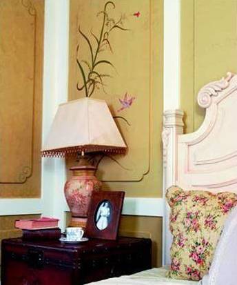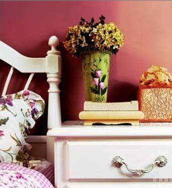 屏風(fēng)也可以用于床頭裝飾。在經(jīng)過作舊處理的鐵藝床床頭后面放一架煙青色嫩黃碎花圖案屏風(fēng),不僅柔化了床架的質(zhì)地和造型帶來的中性視覺感受,而且還利于遮擋窗外繁雜事物,避免分心。