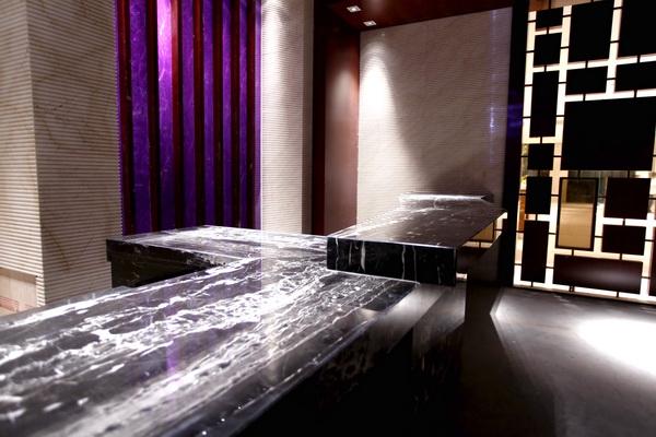黑色石材臺板,米黃色石材背景墻,背景燈光……給人以時尚現(xiàn)代溫馨之感