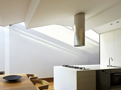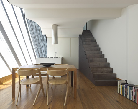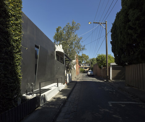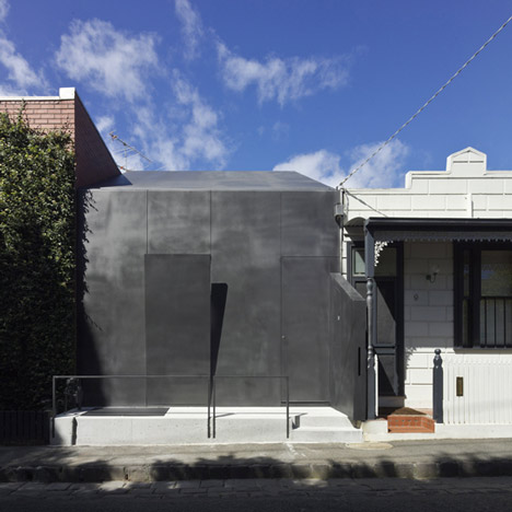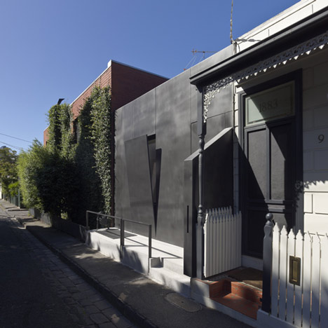 一個像吊橋一般的門板從鋼鐵覆蓋的住宅表面敞開,展示出臥室的窗戶。澳大利亞建筑師Muir Mendes為自己設(shè)計的住宅別具匠心。建筑占據(jù)之前的一個工人木屋,三邊被其他住宅環(huán)繞。因為要防白蟻,所以設(shè)計采用鋼鐵結(jié)構(gòu),包括門,窗戶框架和連接等,還有一個涂過防蟲油脂的地板。臥室,起居室和浴室占據(jù)首層,二層是一個書房,臥室和浴室。一個雙高的門廊橫跨住宅,由天窗自然照明。