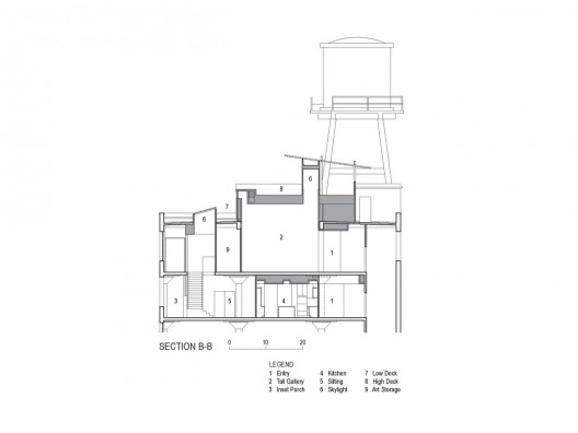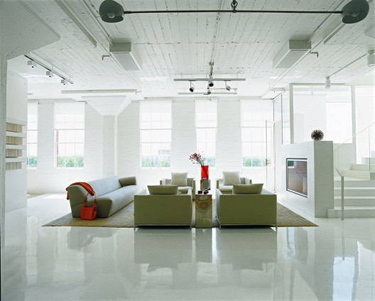 這是為一個(gè)藝術(shù)收藏家設(shè)計(jì)的住宅,閣樓占據(jù)一個(gè)20年代老工廠建筑的最高兩層及屋頂。新舊結(jié)構(gòu)都呈現(xiàn)出干凈的白色,以突出已有結(jié)構(gòu)及木框架混凝土與新墻壁、光滑環(huán)氧樹(shù)脂地板及噴漆櫥柜之間的背景反差。