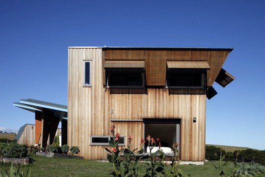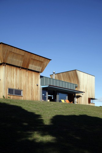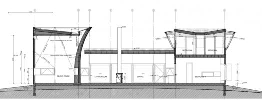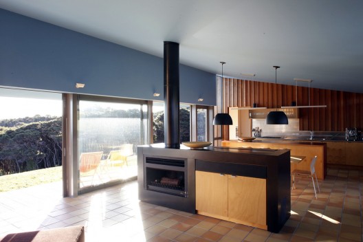 客戶的要求是住宅的設(shè)計(jì)感要大于預(yù)算,并希望住宅能夠?yàn)樗麄兲峁┎煌纳罘绞?。廚房餐廳起居空間是一個(gè)大的開闊空間,都位于一個(gè)像露營(yíng)地經(jīng)??匆姷恼谂裣旅?,這是一個(gè)非正式的玻璃包裹的亭子,兩邊被杉木覆蓋的私人空間結(jié)構(gòu)圍住,亭子是幾乎透明的,而兩個(gè)杉木盒子則是遮蔽的。