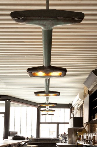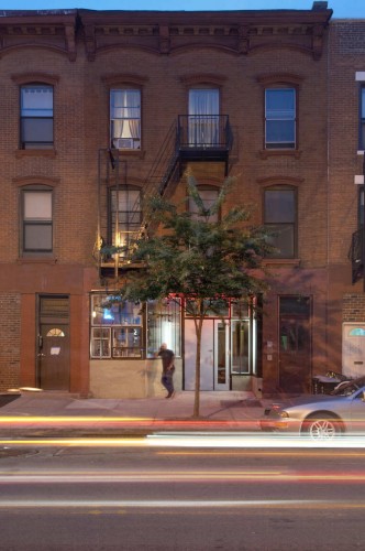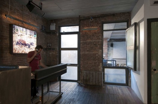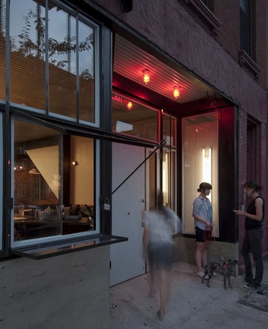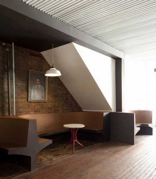 這是一個(gè)新的酒吧,它帶有舒適開(kāi)闊的室外空間,還有一個(gè)立面上的無(wú)電梯咖啡間。建筑師與藝術(shù)家主人一同合作,共同設(shè)計(jì)這個(gè)店的新店面,室內(nèi),及后面院落空間。這個(gè)建于19世紀(jì)90年代的老房子需要結(jié)構(gòu)上的重要維修和升級(jí)。新的梁和柱一直延伸至地窖中,它們使室內(nèi)空間更加開(kāi)闊。