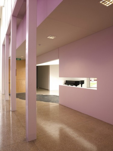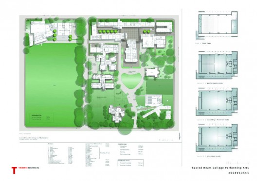 這個(gè)項(xiàng)目是圣心學(xué)院整體規(guī)劃后的第一個(gè)重要項(xiàng)目,它展示出圣心學(xué)院的宗旨和焦點(diǎn),即回歸其作為一個(gè)當(dāng)代教學(xué)機(jī)構(gòu)的身份,并保證對(duì)教會(huì)成員的至高服務(wù)。新設(shè)施通過(guò)在一個(gè)重要?dú)v史區(qū)建立一個(gè)現(xiàn)代的建筑,強(qiáng)化了學(xué)院剛剛起步的表演藝術(shù)分科。建筑張開兩翼,在之間形成通道,以吸引人們進(jìn)入它的玻璃入口及室內(nèi)。