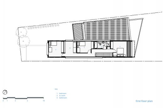 這個(gè)新住宅建于一個(gè)緊湊的地形內(nèi),立于高高的懸崖上,像楔形般的結(jié)構(gòu)南北走向,附近的建筑靠近邊界,呈東西走向。巨大的鰭形墻壁將入口和流通元素與起居空間和花園分開,為上層的臥室結(jié)構(gòu)提供足夠的隱私和結(jié)構(gòu)支持。主要的起居空間與花園空間相連,并能享有獨(dú)特海景,建筑設(shè)計(jì)最大限度地利用幾何結(jié)構(gòu),呈現(xiàn)出向著懸崖方向延伸打開的結(jié)構(gòu)。結(jié)構(gòu)墻的精心安排,高大的玻璃,樓頂?shù)男螤疃紕?chuàng)造出開闊的起居空間,這里自然光充足,通風(fēng)流暢,既有隱私,又能享受獨(dú)特景色。