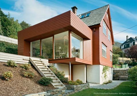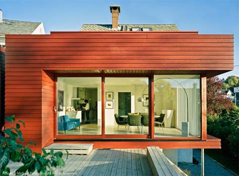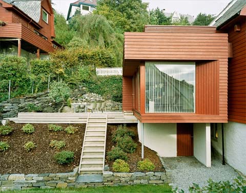 如何在二十一世紀初擴建一個二十世紀的住宅,項目是為一個緊湊的住宅設計一個30平方米的擴建部分,這個部分要與傳統(tǒng)的老房子形成對比反差,設計沒有模仿舊形式,而是故意形成不同,但是建筑材料和顏色的相似性還是呼應了老房子的特點。擴建部分大多數(shù)是木質(zhì)的結(jié)構(gòu),一部分是鋼鐵結(jié)構(gòu)和涂漆的木質(zhì)滑板。人們要通過老房子才能進入擴建部分。