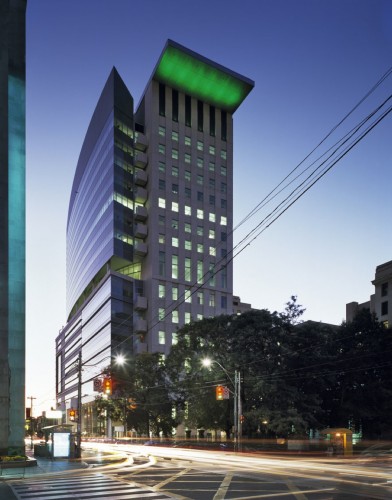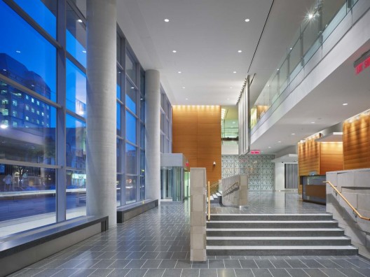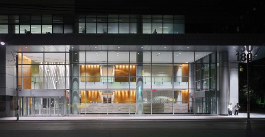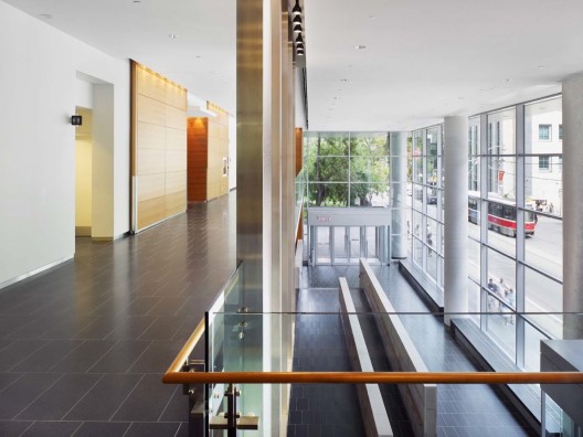 設(shè)計將一個七層的平臺和樓上八層的樓層相結(jié)合。一個雙高的樓層位于塔樓的基底,它相對于南側(cè)和西側(cè)的上層樓層較為靠后,創(chuàng)造出一個間歇空間,減少了上層對街道平面的壓力。設(shè)計共高77.5米,在建筑東側(cè)融合一個列拱,并且在中區(qū)形成一個全程室內(nèi)通道以滿足法律要求。