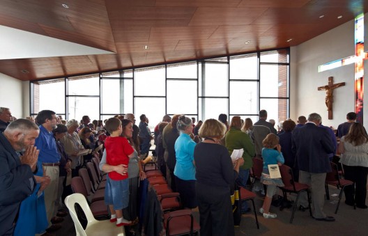 這個(gè)建筑主要是由三個(gè)互相交織的體量組成,它們形象地代表了神圣的基督教三位一體。巧妙的安排將周圍美麗的景色盡收眼底。主要空間是東西朝向的,南面是一整面的玻璃墻,它將整個(gè)金萊克峽谷作為自己的背景,為室內(nèi)空間增色不少。東側(cè)一系列的景觀窗戶將清晨的陽(yáng)光過(guò)濾到舉行集會(huì)用的雙高空間中,既可以照明也能提供太陽(yáng)能。