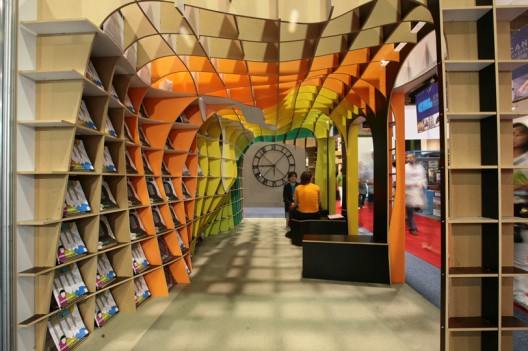 這個(gè)亭子的建造和材料都是由Masisa贊助的,它是拉丁美洲最著名的MDF板生產(chǎn)商之一,它們要求結(jié)構(gòu)必須要展示出它們材料的無(wú)數(shù)種可能。設(shè)計(jì)師因此選用了兩種顏色系列,一是從黑色到白色,包括一些木質(zhì)材料色澤,另一種是深綠色到橙色系列。這其實(shí)主要是一個(gè)用于休息的亭子,逛累的游客可以進(jìn)來(lái)坐下休息,讀讀雜志,避在一個(gè)像蠶繭一般的角落,遠(yuǎn)離周圍的噪音。四個(gè)扭曲的元素充當(dāng)座椅和儲(chǔ)藏空間。