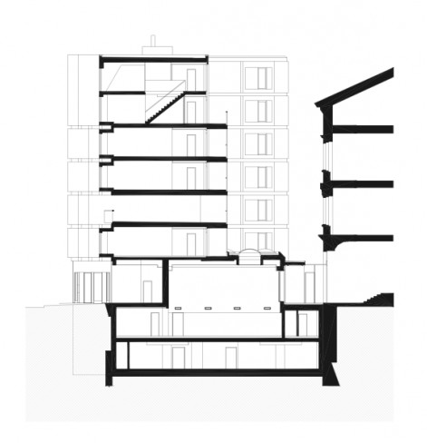 這個項目的整體設計采用包含著空間單元的磚盒子結構。由大廳定義的垂直樓梯的位置規(guī)劃了整體空間,呈現(xiàn)出一個開闊的水平走廊。項目中樓層之間有被夾住的體量,它們的面積與公寓單元相呼應。為了與附近建筑一致,為了保證自然光和空氣的良好吸收,為了打開一個傳統(tǒng)的空間滿足人們的交流需要,項目立面上一部分磚塊被打開移走,形成了獨特的開口。