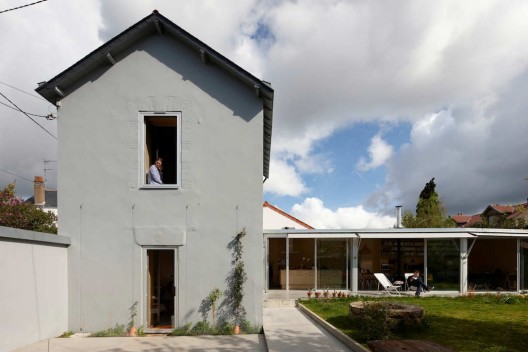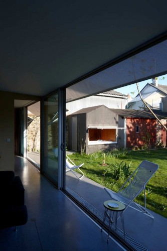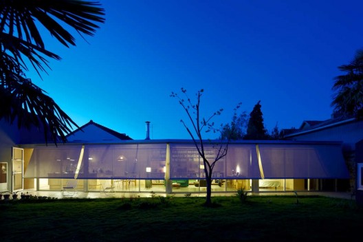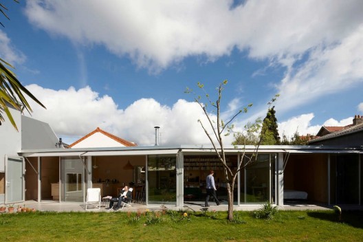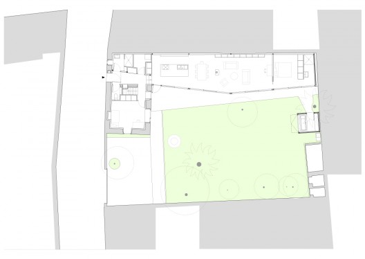 這個住宅的場地位于之前的一個廚房花園區(qū)域,場地周圍是兩米高的墻壁,它們?yōu)榭臻g提供天然的遮擋和保護(hù),形成一個較為內(nèi)部的空間。原有建筑和它的擴(kuò)建部分是沿著界墻修建的,它們組織在一起形成L形的排布。立于中心的是公共空間,周圍聚集的是一些為家庭成員如孩子們,客人準(zhǔn)備的私人空間元素,一些別的設(shè)施沿著街道排布,另有較為隱蔽的房間和浴室則位于花園的另一側(cè),在起居空間的縱向位置。