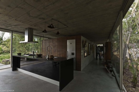 這個(gè)住宅位于墨西哥的Jiutepec,場(chǎng)地是一塊開闊的土地,之前用于生產(chǎn)和銷售Fichus樹種。設(shè)計(jì)概念是不打擾自然環(huán)境。住宅是很快建成的,呈現(xiàn)出簡(jiǎn)單的形式,多虧了混凝土,人們很難區(qū)分出室內(nèi)室外。設(shè)計(jì)呈現(xiàn)出的是一個(gè)面積很大的住宅,從一點(diǎn)有時(shí)都很難看到全部。因?yàn)闃淠痉N植得都很密集,它們長(zhǎng)得還高高大大,因此設(shè)計(jì)決定依仗這一優(yōu)勢(shì)來阻擋過強(qiáng)的太陽光,同時(shí)開辟透明立面,吸收適量太陽光。