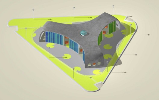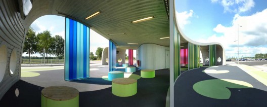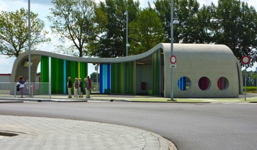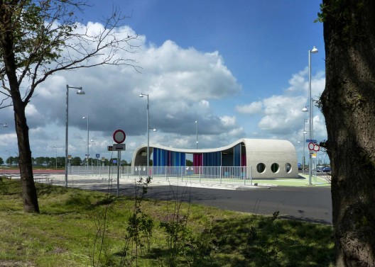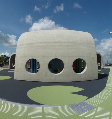 這個項目位于荷蘭霍赫凱爾克,是Park+Ride的一個公車站,Park+Ride為六百多個車輛,自行車提供停車空間,還為換乘提供很多不同的選擇。公車站呈現(xiàn)出百合葉子般的形狀,三個結構向外延展,將室內空間打開。百合葉子是對附近鄉(xiāng)村景色的暗示。結構主體是一個穹頂?shù)幕炷翚んw,三面被切開,包含很多圓圈,拱形和半圓。內部是一個三角形的金屬核心,包括一個為殘疾人準備的洗手間,儲備室和司機休息室。建筑的形狀奇特干凈,它的開闊性反而創(chuàng)造出公共的安全性。