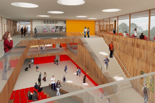 這個占地8500平方米的學院像一個巨大的住宅,面朝美麗的濕地,為1300位學生提供工程,醫(yī)療,服務等學科的教學服務。建造將于2012年開始,預計于2014年完工。建筑中心是一個巨大的中庭,它呈現(xiàn)出一個巨大的看臺結(jié)構(gòu)。它是重要的聚會中心,并能從不同的樓層進入。這里是不同的學科展示區(qū),綜合性地為人們展示出學院的構(gòu)架和它能為學生們提供什么。這個學院有一種既受人歡迎又大氣的感覺,這種大氣是由木質(zhì)板面和開闊立面上的玻璃材料交替使用而呈現(xiàn)出的流暢形式表現(xiàn)出來的。設計的一大目的是為了獲得建筑的可持續(xù)性。