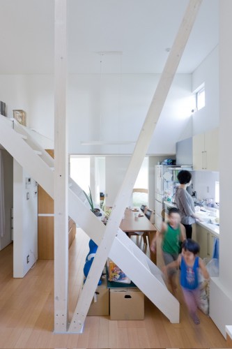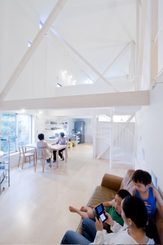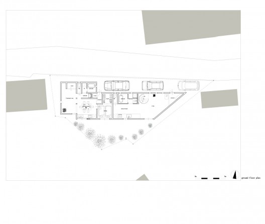 這個(gè)住宅位于日本神奈川的一個(gè)十字路口處,離附近的車站只有十分鐘,周圍布滿很多老建筑。馬路對(duì)面是一個(gè)兩層的木質(zhì)公寓,后面是一個(gè)巨大的工廠。南側(cè)有一個(gè)三層的住宅綜合體,西側(cè)是一個(gè)老舊的住宅。項(xiàng)目比周圍建筑稍大,因?yàn)槭菍?duì)已有建筑的重建,所以沒有贈(zèng)予稅。項(xiàng)目是為兩代家庭設(shè)計(jì)的,設(shè)計(jì)要考慮到兩代家庭之間的適當(dāng)距離,同時(shí)要包含三個(gè)停車空間。