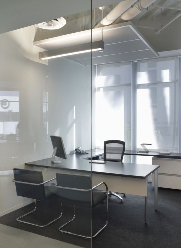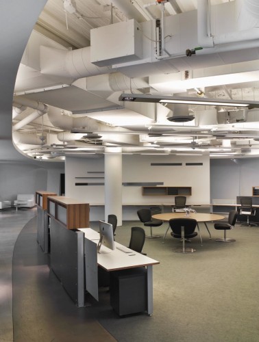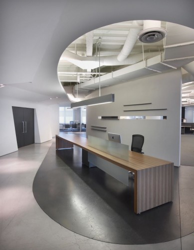 這是一個(gè)公司的總部辦公空間,是為一個(gè)年輕的混凝土科技發(fā)展公司打造的,設(shè)計(jì)目的是營(yíng)造一個(gè)智慧聚集地,鼓勵(lì)互動(dòng),并反映他們正在開發(fā)的創(chuàng)新綠色產(chǎn)品。這是一個(gè)開闊流動(dòng)的簡(jiǎn)約的空間,它能促進(jìn)員工之間的互動(dòng)并形成創(chuàng)新的思考方式。一進(jìn)入空間,人們就會(huì)被直接帶入公司中心區(qū),通過互動(dòng)和交流迅速成為其中的一部分,設(shè)計(jì)拋開傳統(tǒng)的接待臺(tái)和等待區(qū),以一個(gè)長(zhǎng)長(zhǎng)的工作臺(tái)代之,用以展示公司產(chǎn)品和充當(dāng)一個(gè)會(huì)議桌。雕塑形和精致的建筑元素點(diǎn)綴在暴露的機(jī)械結(jié)構(gòu)和粗糙的混凝土地板上,營(yíng)造出能表達(dá)公司產(chǎn)品質(zhì)感的獨(dú)特空間。