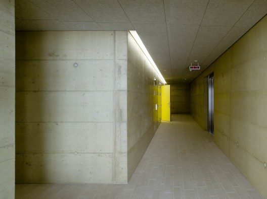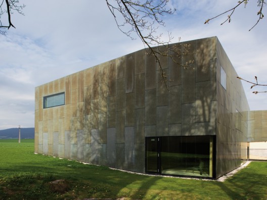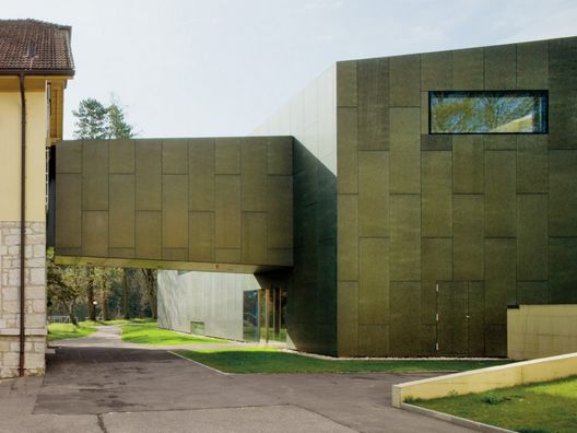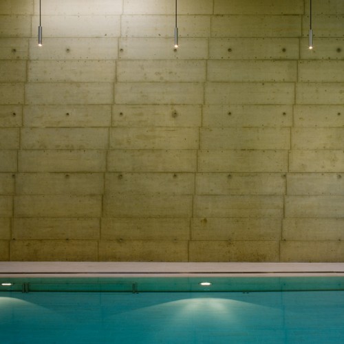 這是Landeyeux醫(yī)院向西的一個(gè)擴(kuò)建項(xiàng)目,包括一個(gè)治療性泳池和一個(gè)物理療法室。新建的體量形成老醫(yī)院和員工公寓之間重要的空間。一個(gè)人行橋?qū)⑿陆ㄖ团f結(jié)構(gòu)相連。新建筑是一個(gè)簡單的體量,體量邊緣有微妙的角度;建筑表皮是由銅制板面組成,表面完全拋光以創(chuàng)造出絕對平整的效果。人行橋在這里充當(dāng)主要體量的附屬結(jié)構(gòu),通過材料的運(yùn)用與主要結(jié)構(gòu)相呼應(yīng)。雙高的泳池與景觀通過一系列窗戶進(jìn)行互動(dòng),巨大的天窗和室內(nèi)窗戶為物理治療室提供充足的自然光。帶顏色的粗糙的混凝土墻壁包裹主要的項(xiàng)目空間,之間的空間則是流通空間。地板和天花板處可見補(bǔ)充性的材料。