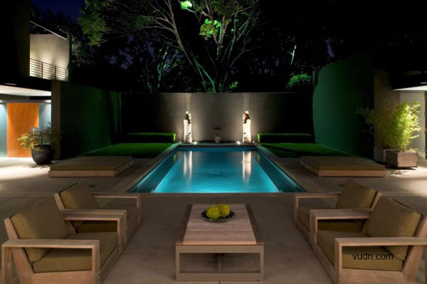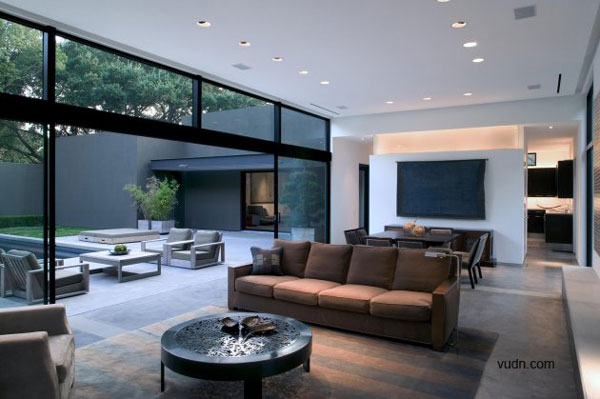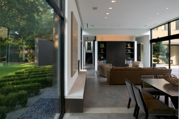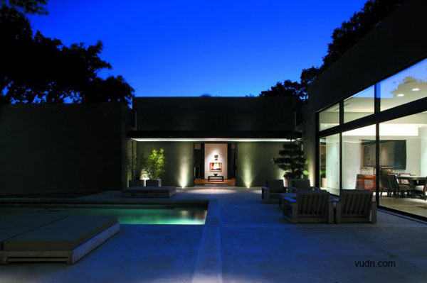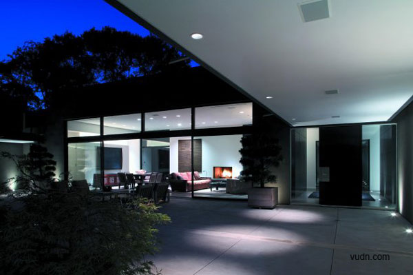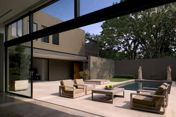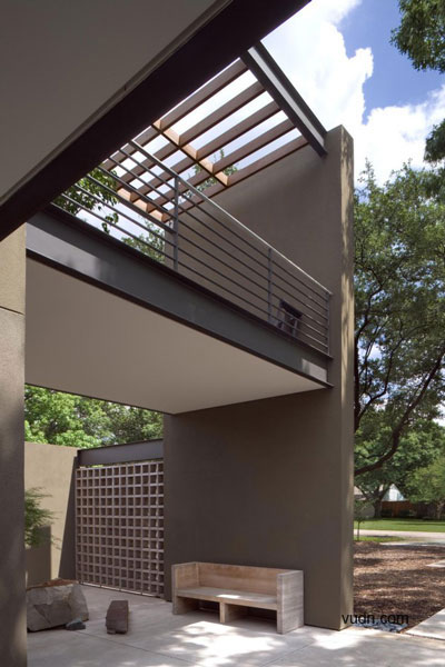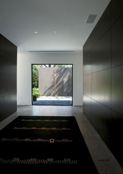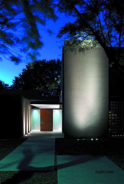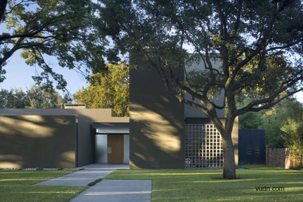 別墅位于大型成熟樹(shù)木的前面,一條繁忙的主干道在后方,這是一個(gè)有難度的設(shè)計(jì),但建筑師卻很巧妙的處理了這個(gè)傳統(tǒng)的家庭別墅與周圍環(huán)境之間的關(guān)系。建筑師選擇了黑、灰還有綠色做為別墅的整體色彩,這樣可以使別墅更好的融入現(xiàn)有的樹(shù)冠當(dāng)中以及通過(guò)顏色的視覺(jué)感來(lái)減弱它們之間的差異,內(nèi)部的設(shè)計(jì)則是利用亮藍(lán)色為主色調(diào)。這是一個(gè)能讓人們期待的設(shè)計(jì),別墅外部可以融入周圍的環(huán)境,但內(nèi)部卻可以融入整個(gè)達(dá)拉斯的天空。