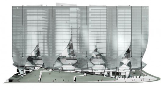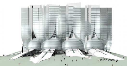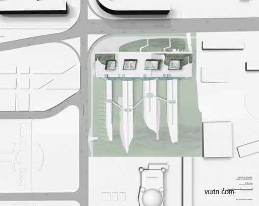 Eric Owen Mo建筑師事務所在哈薩克斯坦的阿拉木圖國會大廈旁創(chuàng)作了一個混合使用的新大廈。共和國廣場是一個阿拉木圖大規(guī)模發(fā)展中的一個項目。這個大廈有126,000平方英尺,將分為零售空間,辦公室,酒店和住宅。建筑物是用直徑38米的螺旋柱支撐。此功能將附上一個室內廣場或者“冬季花園”在建筑的兩邊。螺旋柱提供了主要的結構支持和連接了地面的5個公共場所。在這5個公共場所之間的空間有四個庭院,并且每個庭院的特征各代表了一年中四個季節(jié)。