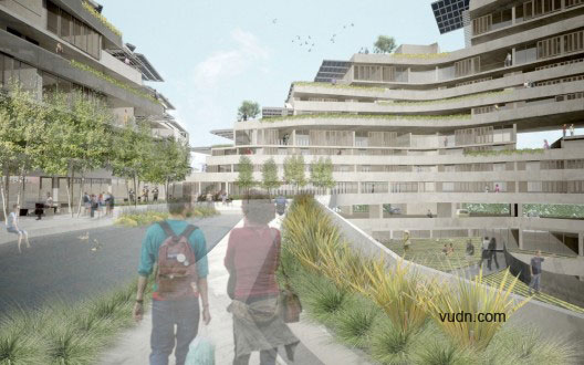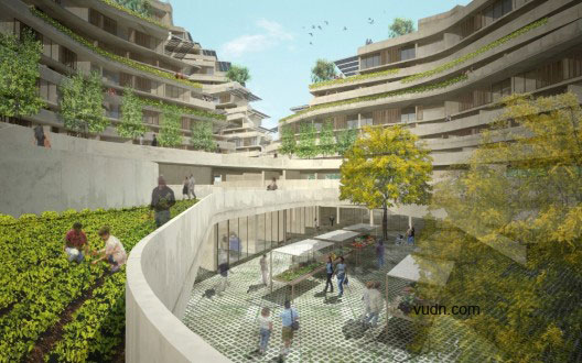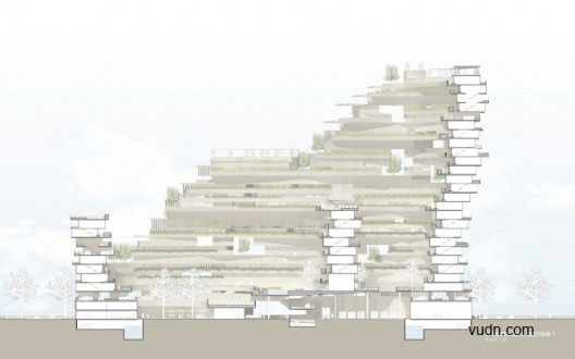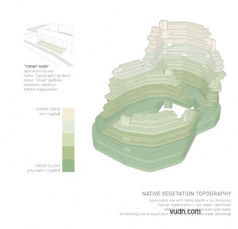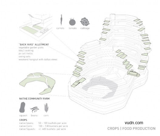 該作品是Standard建筑事務(wù)所的概念設(shè)計(jì),Co-Op峽谷近期已經(jīng)獲得視覺達(dá)拉斯競(jìng)賽的榮譽(yù)獎(jiǎng)。該競(jìng)賽為參賽者提供了創(chuàng)建一個(gè)革新和可持續(xù)的城市社區(qū)原型的機(jī)會(huì)。Standard建筑事務(wù)所激進(jìn)的將焦點(diǎn)集中在了居民如何通過參與建設(shè),農(nóng)業(yè),維修,教育和保護(hù)方案的實(shí)施,來維持社會(huì)。Co-Op峽谷為1000多個(gè)使用者創(chuàng)建了一個(gè)可持續(xù)的,零排放二氧化碳的空間。該項(xiàng)目靈感來自于Anasazi的印第安人的懸崖住所,Co-Op以梯田作為元素,可俯瞰郁郁蔥蔥的城市峽谷。居住區(qū)以前后花園相連,前花園種植鄉(xiāng)土樹種,以不同葉色和品種為主,后話語(yǔ)重點(diǎn)強(qiáng)調(diào)了兩端的平臺(tái)。