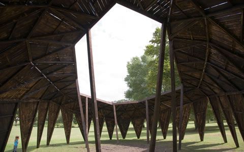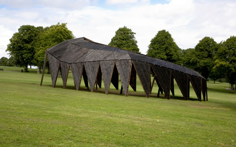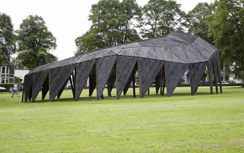 藝術(shù)家 Heather &am Ivan Morison攜手建筑師Alex Sash 設(shè)計了一個臨時搭建物稱為“烏云”,坐落在英國布里斯托爾維多利亞公園。 其結(jié)構(gòu)是一個解構(gòu)網(wǎng)格球頂,其中152個獨(dú)特的木材三角形,創(chuàng)造一種獨(dú)特的形式。 這座“烏云”將在今后幾個月內(nèi)按托管程序繼續(xù)保留在公園。