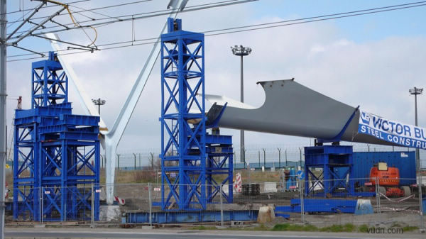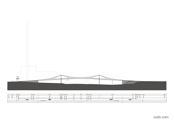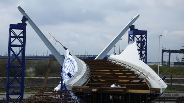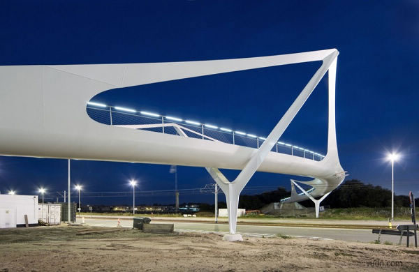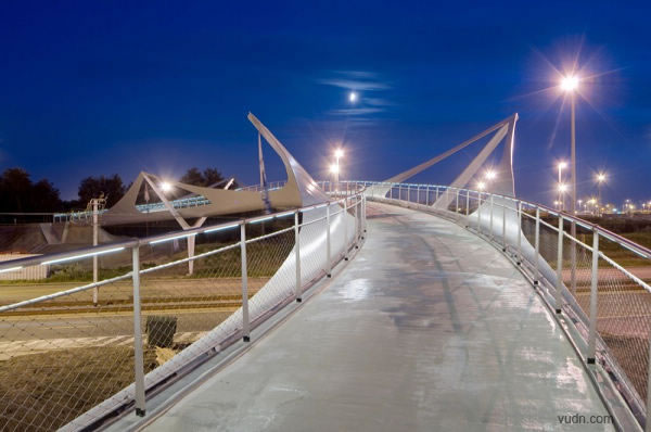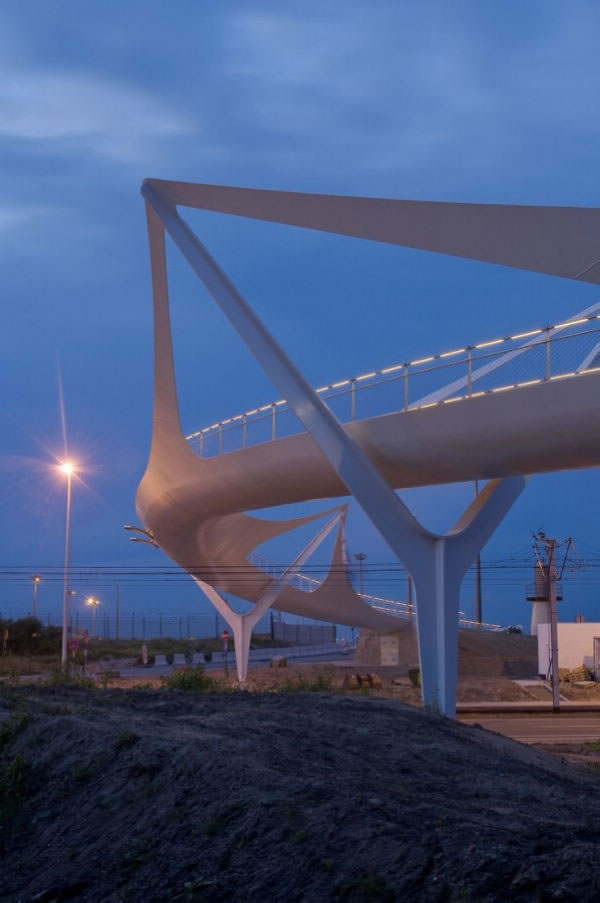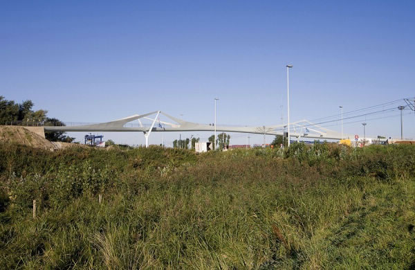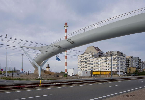 這座步行橋位于伊麗莎班女王大街,它并連接克洛克與奧斯坦德。它有兩個(gè)功能:一方面,坐落于堤圍澤地上的橋把海堤與綠化帶連結(jié)起來(lái),腳踏車(chē)愛(ài)好者和行人得以觀光。另一方面,橋標(biāo)志出海濱城市克洛克-海斯特的入口。橋的靜態(tài)模型是一道102米長(zhǎng),橫臥于四個(gè)支撐點(diǎn)上的連續(xù)橫梁,使跨度處于28m/46m/28m的比較理想狀態(tài)。