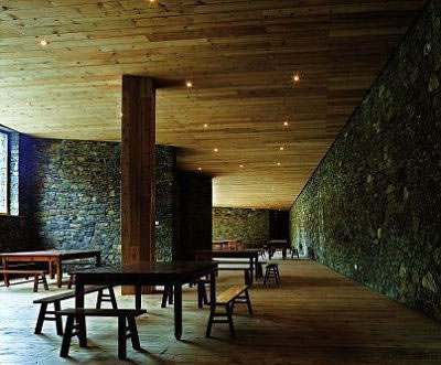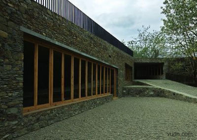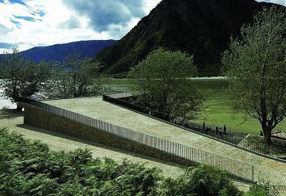 碼頭的規(guī)模很小,只有430平米,功能也很樸素,主要為水路往返的旅行者提供基本的休息、候船、衛(wèi)生間、和惡劣天氣情況下臨時過夜等功能。建筑是江邊復(fù)雜地形的一部分,一條連續(xù)曲折的坡道,從江面開始沿岸向上,在幾棵樹之間曲折纏繞,坡道與兩棵大樹一起,圍合成面向江面的小庭院,庭院由碎石鋪成,可以供乘客休息觀景。由庭院再向上,坡道先穿過上層坡道形成的一個挑空過道,經(jīng)兩次左轉(zhuǎn)懸空越過自己,然后再次右轉(zhuǎn),并在高處從兩棵大樹之間穿出懸挑到江面上,成為一個飄在江面上的觀景臺。