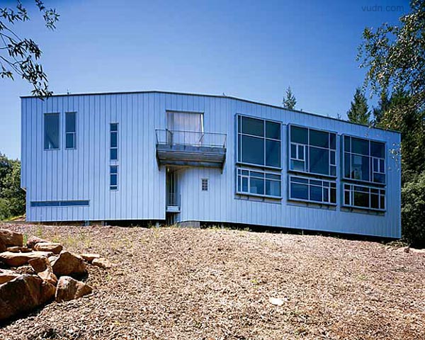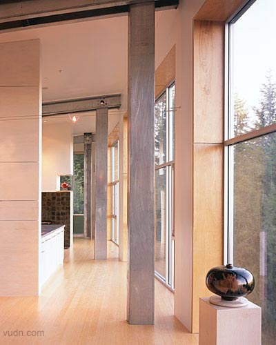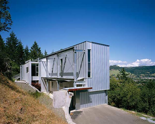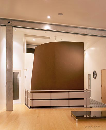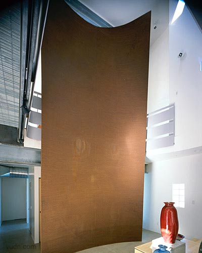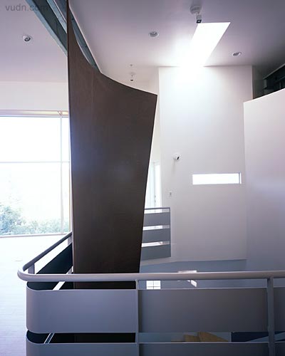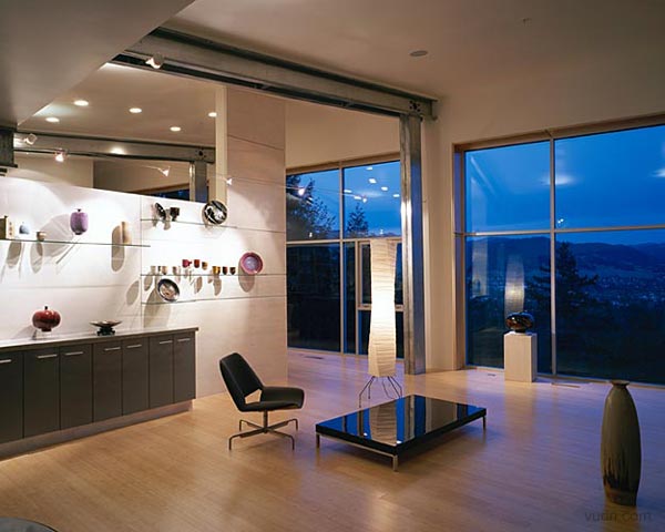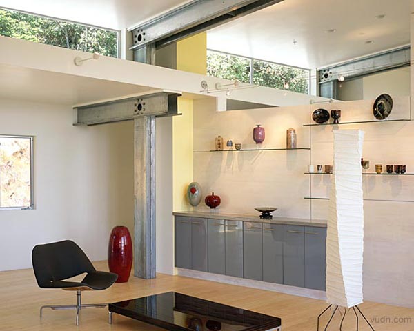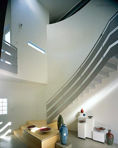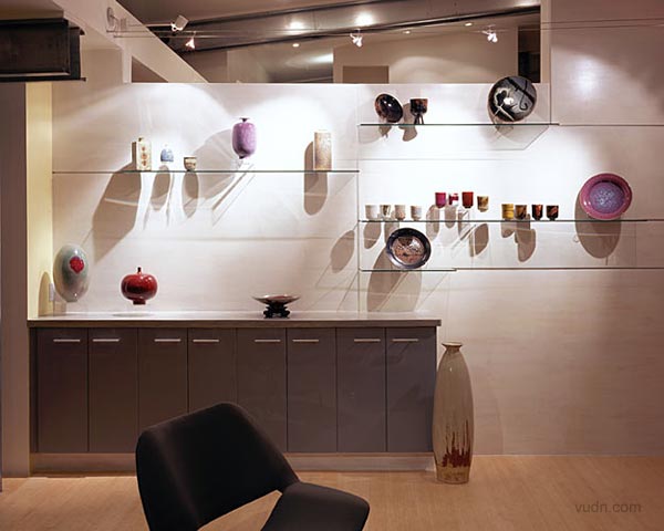 背靠一處山坡,鋼結(jié)構(gòu)的房屋。進(jìn)入一個強(qiáng)烈垂直的空間,一層是陶器作品的展示,一面弧形樓梯和墻壁上進(jìn)入上部空間,透過這個空間進(jìn)入樓上工作室,構(gòu)思創(chuàng)作作品的地方,有一些作品的陳設(shè)。