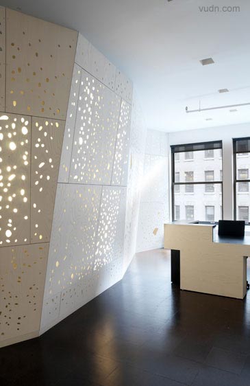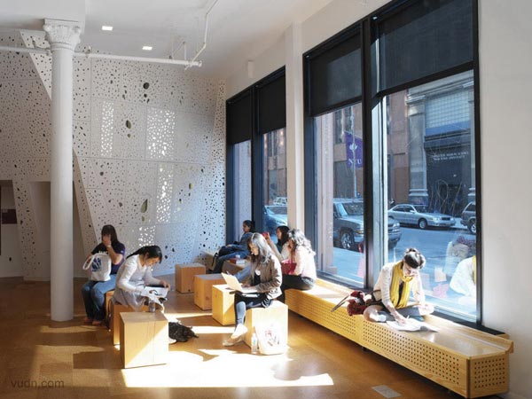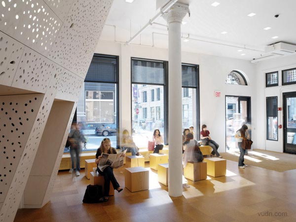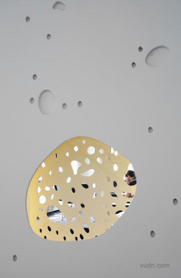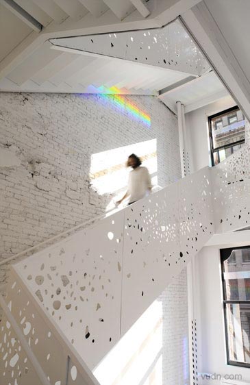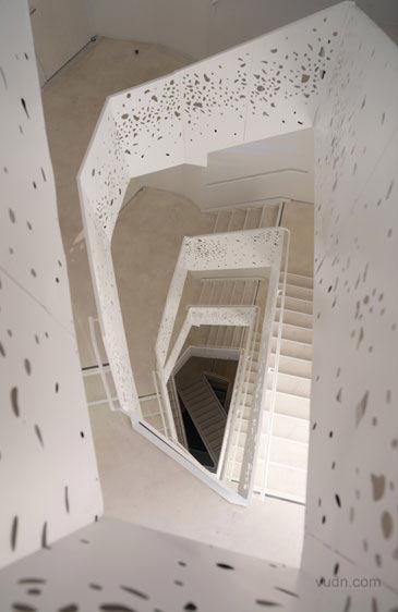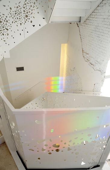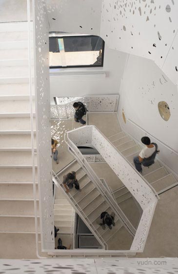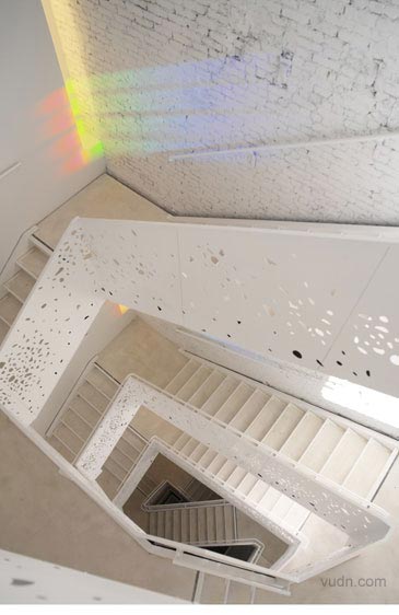 藝術與科學空間的互動。臺階軸下面天窗的加入孔隙度,在墻上形成斑駁的紋理。光與影的這一變化,是在闡述“影子的白光”的現象。南方面臨的樓梯間窗戶安裝了棱柱形膜對,陽光照射地面成為一個棱柱形的彩虹。軟木地板,做了不同的色調和紋理的黑白。