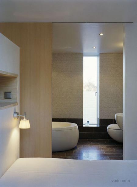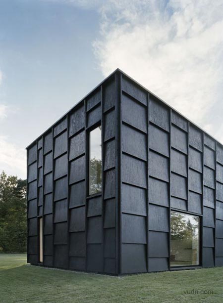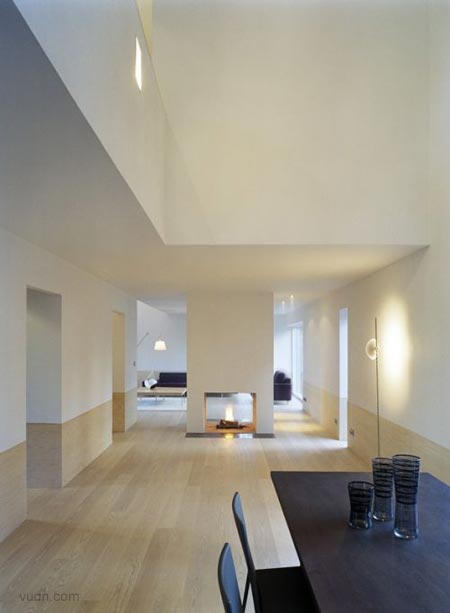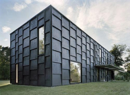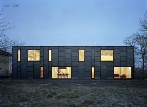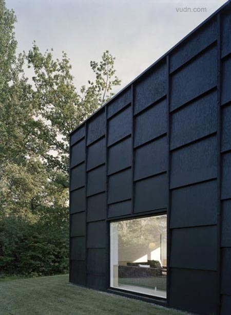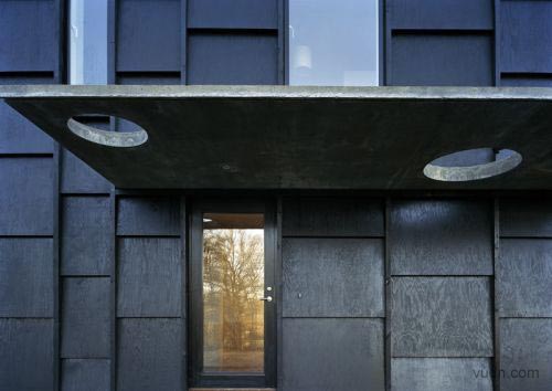 太空空間建筑感覺的房子。外觀看是一個薄塊切割鑲拼起來的,雙臺階和屋頂陽臺。 充分利用寬度的空間,房子在一個正面的角度看幾乎完全是是一條線,墻壁保持了一定的深度,像在太空的生活。入口和樓梯怎樣可以成為地面上一個方框,通過它進(jìn)入樓上臥室。內(nèi)部是在兩個層面的一個連續(xù)空間。 房屋的特點(diǎn)是直觀簡捷的途徑,活動空間的重疊。主體結(jié)構(gòu)是在原位現(xiàn)澆混凝土,在入口的懸臂式天篷,只有7厘米厚的。采用熱絕緣材料,降低了成本, 內(nèi)部是成品白石膏,所有的地板和木質(zhì)的細(xì)節(jié)是白色的灰。外立面都沾滿黑色18毫米膠合板面板安裝在大松木框架中。