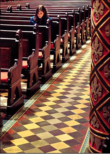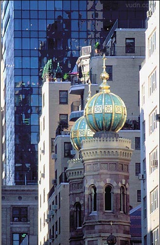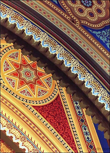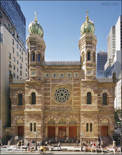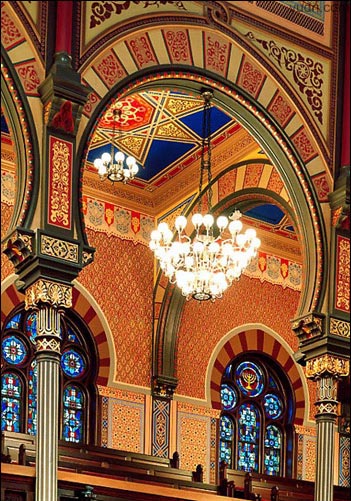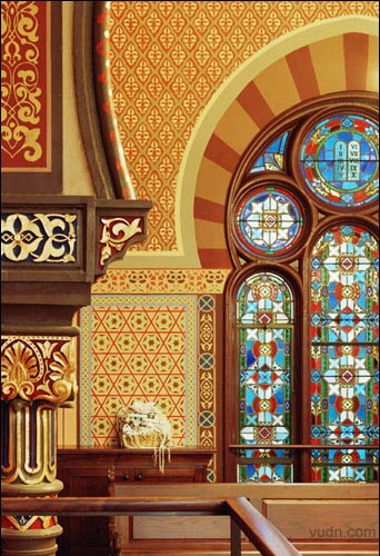 紐約猶太教堂內(nèi)的華麗裝飾,精致的彩繪和壁雕,彩色鑲嵌玻璃,裝飾出神圣莊嚴的禮堂。