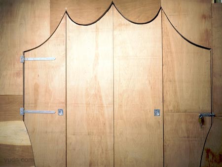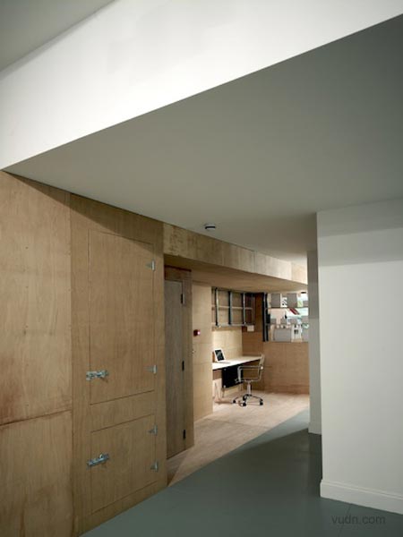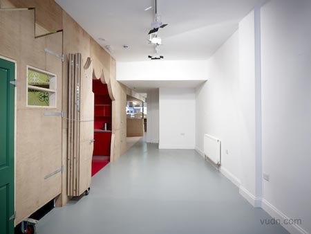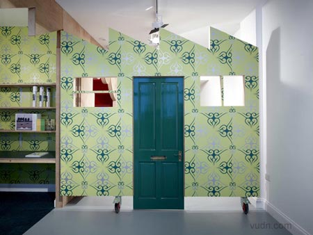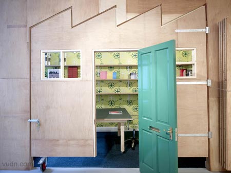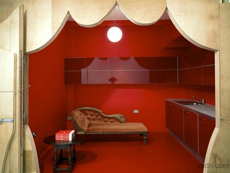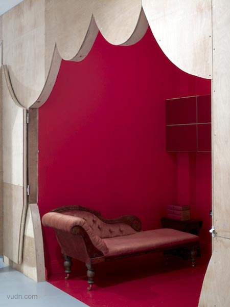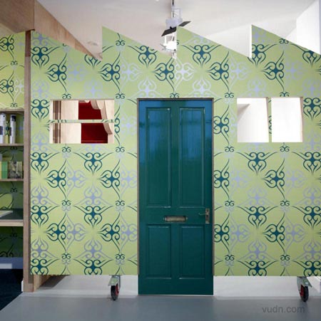其中一邊墻上是一個淺的空白的空間,在另一邊,色彩繽紛圖案顯示,這層墻打開,運用一些突發(fā)性和戲劇性的方式,把木板做出窗簾褶皺來。