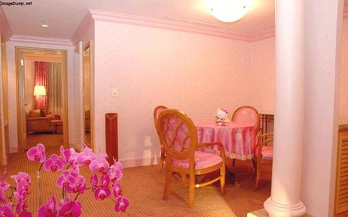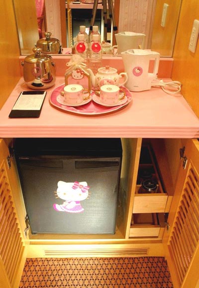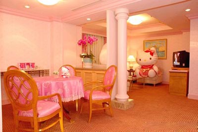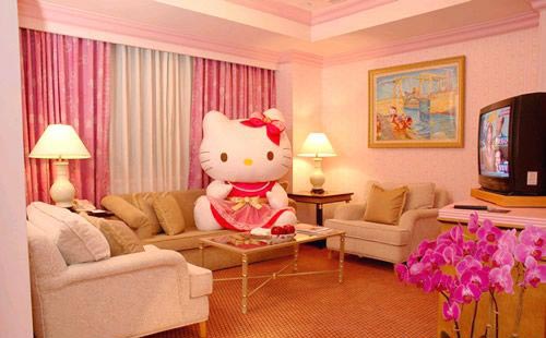 只能用夢幻兩字形容眼前粉紅世界,看到的、摸到的、踩到的,hello kitty全攻陷??蛷d壁紙,窗簾,沙發(fā)抱枕,桌布椅布。房間被單,枕頭,桌燈。連浴室,也幾乎只有一個(gè)顏色。kitty親善大使:還有墻上看到的,都是hello kitty的經(jīng)典名畫。