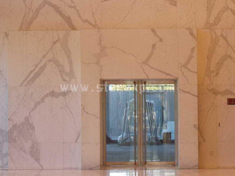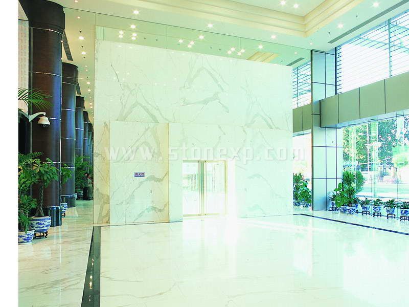 該石材工程屬白色石頭的經(jīng)典工程,表現(xiàn)出一種白色的典雅高貴純潔??梢泽w現(xiàn)工藝難度的地方大面積使用,追紋效果好。該石材工程總體色調(diào)為雪花白。