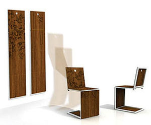 還有一種掛在墻上的椅子就更絕了,粗看似乎是掛在墻上的兩塊木板,其實(shí)是掛在墻上的兩把椅子,木板上的三個(gè)縫隙就是椅子的彎折部位,通過(guò)特殊的連接支撐設(shè)計(jì),就可以折成這樣一把如假包換的椅子了。