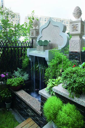 僅有10平米的小花園設(shè)計(jì)為熱帶風(fēng)情,其中包括東方屏風(fēng)造型的水瀑布,及高低錯落有致的花臺并加入可愛的小木屋鳥籠。