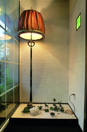 休閑閱讀區(qū):書房另一側(cè),是精心布置的小沙盤,貝殼、小盆景在暈黃燈光下,多么浪漫。臺燈本來要被主人扔掉,設(shè)計(jì)師的妙手回春,讓它明亮至今。