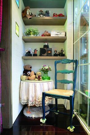 休閑閱讀區(qū):客廳與陽臺之間,連一米都不夠的寬度,也能打造出一個溫馨的所在。田園風(fēng)和客廳里的妖嬈,形成巨大反差。隔架上堆滿了女孩子喜愛的玩偶,這是一個適合看童話,聽音樂的角落。