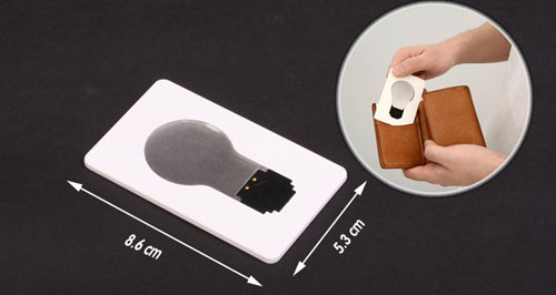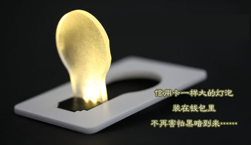 PocketLight僅信用卡大小(53mm×86mm),可以方便地放在錢包中。它的結(jié)構(gòu)也非常簡單,"信用卡"的中間刻著一個"燈泡","燈泡"可以豎起,也可以與"信用卡"平行,同時控制著內(nèi)置發(fā)光體的明滅。相應(yīng)地,"燈泡"由某種具有光導(dǎo)特性的材質(zhì)做成,當內(nèi)置發(fā)光體點亮?xí)r,它會將光導(dǎo)引到四面八方,就像一個真正的燈泡所做的那樣。當你把燈泡合并回卡片中時,燈泡自動熄滅,怎么樣,夠創(chuàng)意吧!