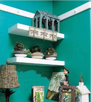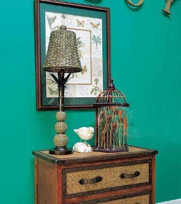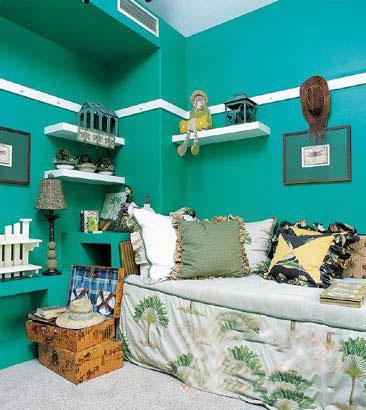 臥室,藍(lán)綠色的墻面色彩將熱帶格調(diào)鮮明地襯托出來,然后用白色的條塊做出擱板和墻面裝飾,擺放懸掛些旅游收集來的趣味擺件和收藏品,空間內(nèi)延續(xù)著度假帶來的快樂和收獲。深淺綠色的床罩、靠墊裝飾可以處理得更加自由隨意,圖案依然有鮮明的統(tǒng)一性,靠墊花色可由自己DIY,不同面料的拼接組合凸顯假日般的輕松氛圍。