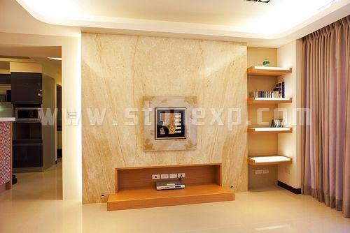 電視墻為米色系花紋石材與木質(zhì)的完美搭配,不僅兩側(cè)安排隱藏光緣,角落的書(shū)架更是別致,木作加玻璃盒子蛻變?yōu)闀?huì)發(fā)光的平臺(tái),形成明度通透光潔的舒適空間。