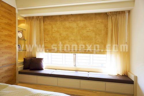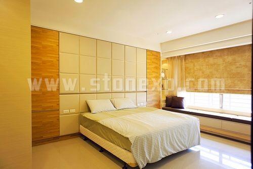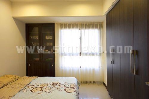 主臥善盡收納機(jī)能的安排,床頭背墻的皮革方格設(shè)計(jì)以及木紋裝飾墻板后方,隱藏著充裕的收納空間,角落鏡面開(kāi)放式層架是展示結(jié)婚照、家庭照最好的地點(diǎn),順著窗臺(tái),染白木紋坐柜加上藍(lán)色椅墊,為主臥增加出休憩及收納的好所在。環(huán)顧全室,沒(méi)有花俏累贅的設(shè)計(jì),有的是一股歷史彌新、舒適寫(xiě)意的生活感,令人不由得心境放松、沉淀了下來(lái)。