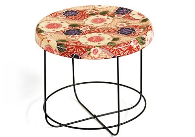 T-UKIYO。有圓形和矩形兩種形狀可供選擇的T-Ukiyo桌子,經特殊工藝處理,將印花棉布鑲入聚酯桌面,底部則由加了PVC防滑墊的紅色噴漆鋼架支撐著。